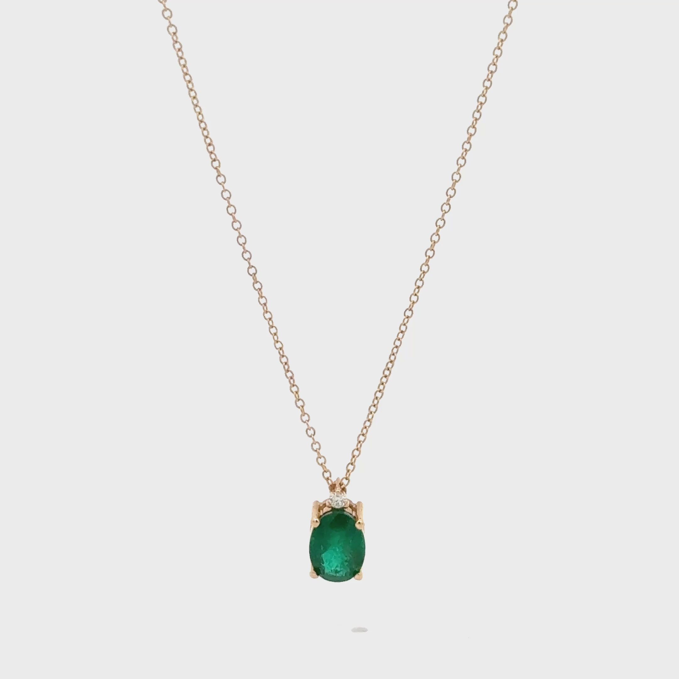 Collar en oro amarillo de 14 quilates con una esmeralda natural en corte ovalado de 0.70 ct, acompañada de un diamante natural de 0.018 ct que aporta un toque de brillo único. Ambas piedras están montadas en engaste de garra (prong setting), lo que realza su color y luminosidad.