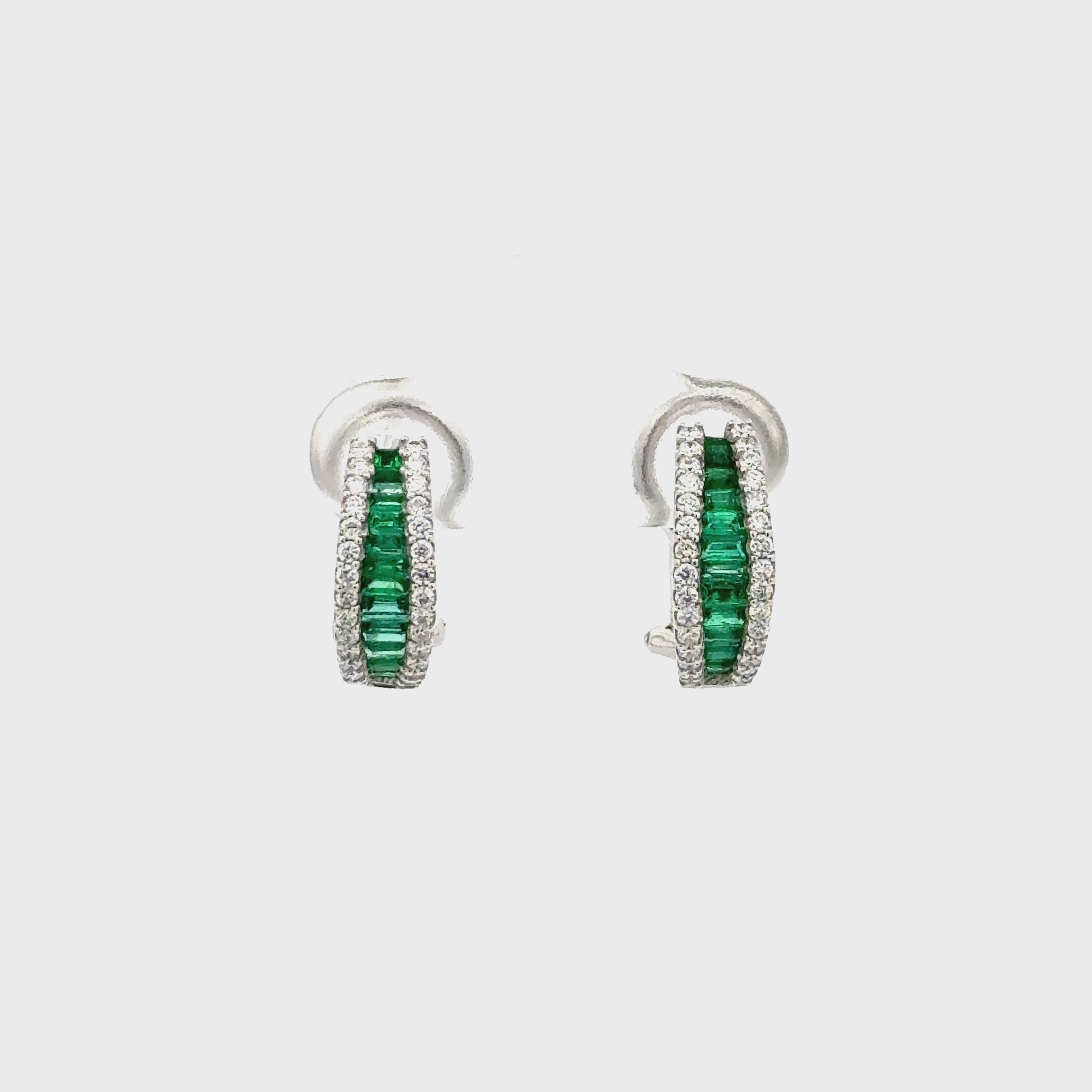 Aretes tipo huggies en oro blanco de 14 quilates, engastados con esmeraldas naturales baguette (0.70 ct) y diamantes redondos (0.36 ct). Su diseño resulta en una pieza sofisticada, moderna y perfectamente equilibrada.