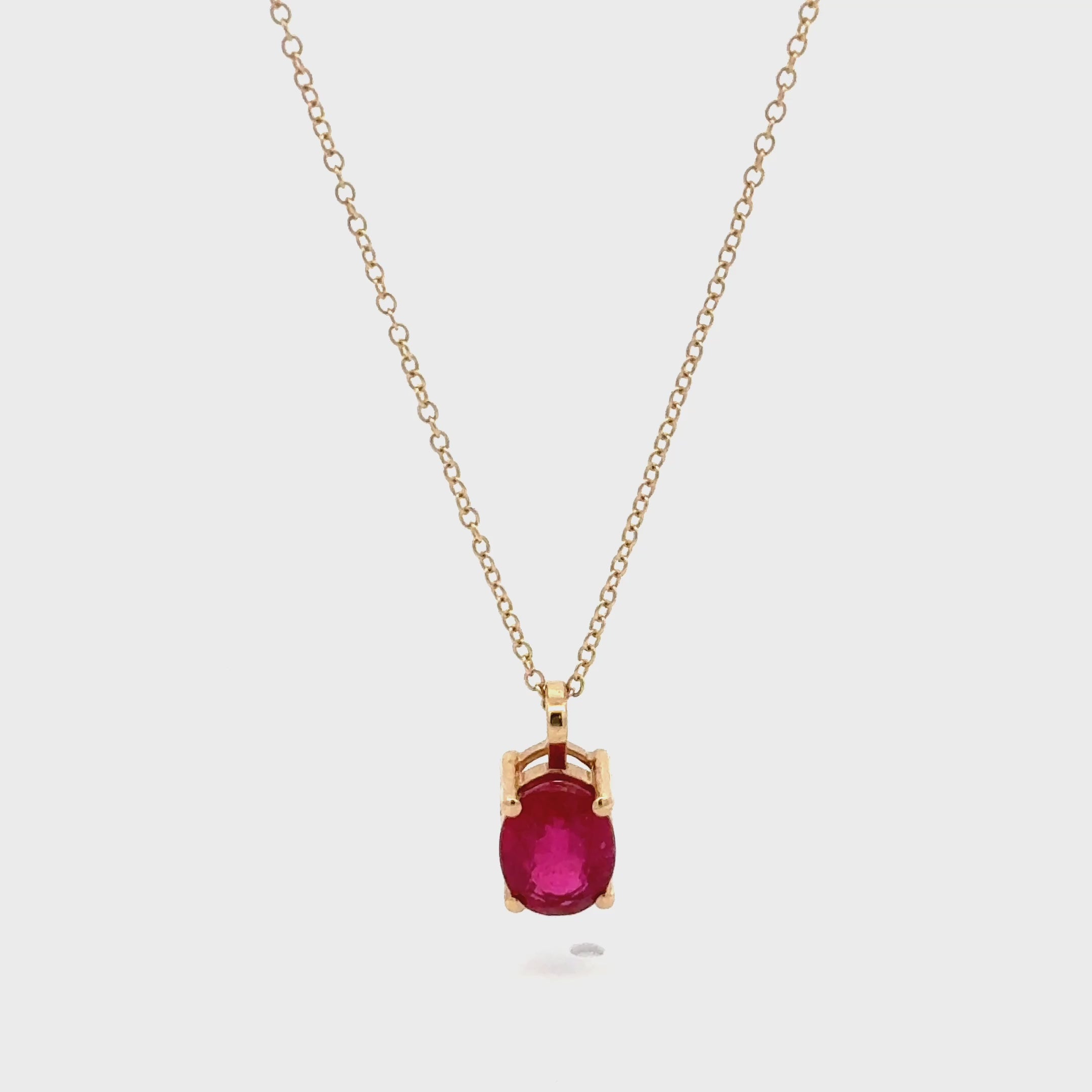Collar en oro amarillo de 14 quilates con dije de rubí natural en corte ovalado de 1.23 ct, montado en engaste de garra (prong setting) que realza su color y brillo. Un diseño clásico y sofisticado que resalta la intensidad del rojo del rubí.